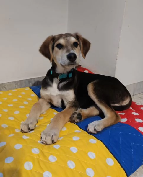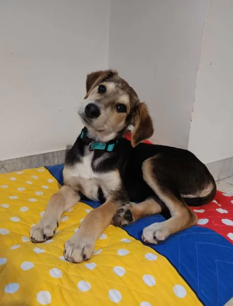 Cucciolo di Bigol sui 4 mesi. Di colore nero bianco e marrone.