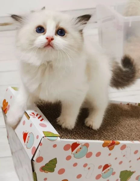 Bellissimi cuccioli di ragdoll dall'esclusivo manto bicolor e magnetici occhioni blu. Intelligenti e molto affettuosi, un vero concentrato di tenerezza. Vanno d'accordo anche con gli altri animali domestici, adatti anche ai bambini grazie alla loro indole che infonde pace e calma. Genitori sanissimi esenti da fiv/felv e malattie genetiche. Consegnati muniti di doppio vaccino, tripla sverminazione, documenti del cucciolo