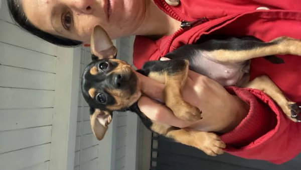 Vendo ultimi 2 cuccioli di pincher di 2 mesi 1 maschio bicolore nero marrone e 1 femmina tutta nera con qualche macchia marrone scuro cuccioli già sverminati molto gioccheroli peso adulto max ...