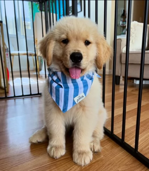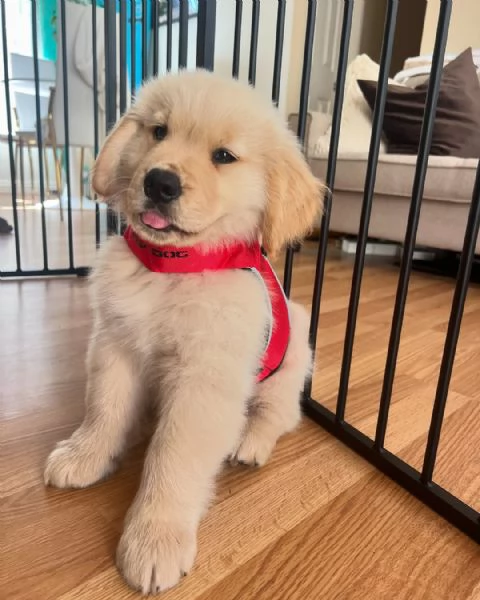 Goldie, un cucciolo di Golden Retriever di 12 settimane, è il nostro ultimo cucciolo disponibile per l'adozione. Tutti i suoi 3 fratelli e 2 sorelle hanno già trovato casa. È microchippato, vaccinato, controllato dal veterinario, sverminato e viene fornito con documenti di registrazione e storia medica. Ama i bambini ed è stato ben socializzato fin dalla nascita. Viene fornito con: