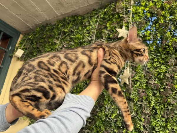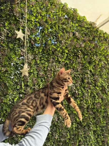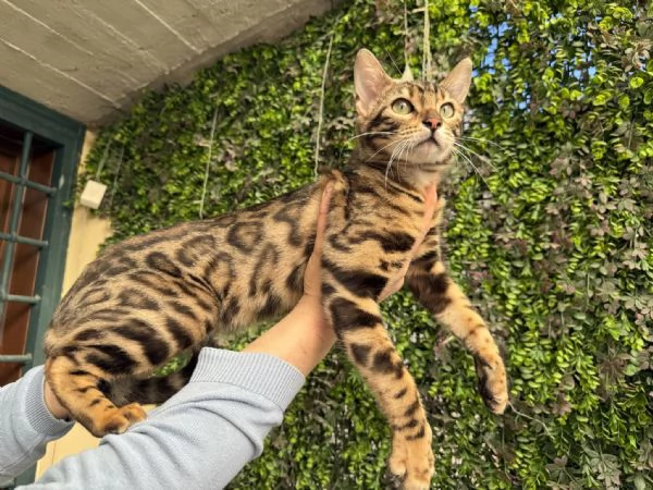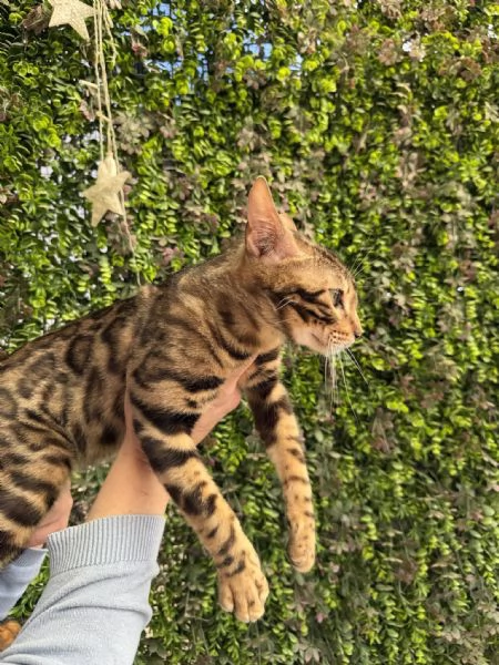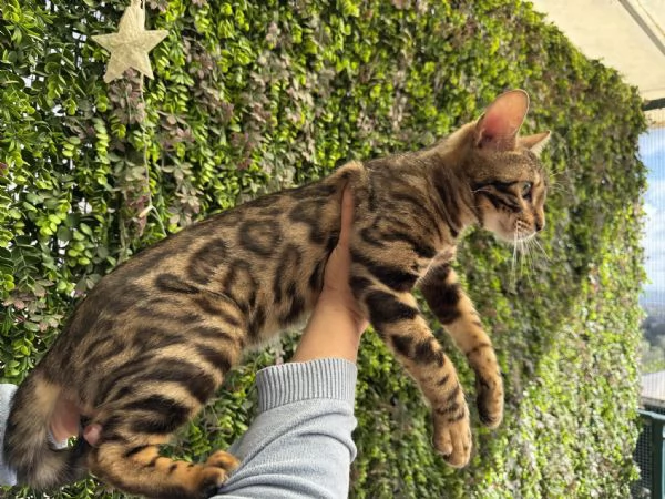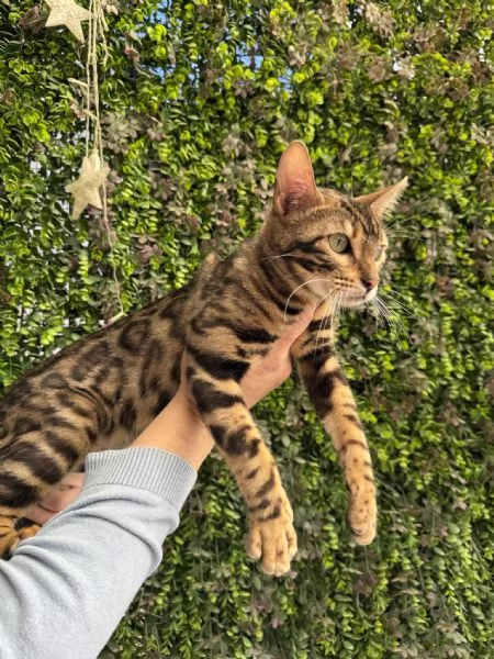 Disponibile fantastica cucciola molto longilinea ed elegante di razza bengala colore Brown spotted Tabby , ideale per le persone con l'allergia con il disegno bellissimo con le rosette scure e in ottimo contrasto di 5 mesi presso Allevamento BENGLAMUR, libretto sanitario comprovante vaccinazioni trivalenti e relativi richiami, sverminazioni e visite veterinarie di controllo . Ha un fantastico pelo setoso lucido e brillante , muso leggermente più particolare con disegni più scuri selvatici , corporatura molto elegante e lunga rispetto un classico gatto domestico con un stupendo musetto con il mento molto pronunciato , occhi belli verdi a mandorla .Cresciuta a casa e dispone un carattere un po’ timoroso, ma curioso, tranquilla, non dispettosa , va d'accordo con gli altri animali . Genitori di altissima genealogia testati ed esenti da malattie genetiche, infettive ed assenti da anomalie. INFO: 392/[hidden]- Ulteriori foto e video sul nostro sito : BENGLAMUR- [hidden] SOLO VERI AMANTI DELLA RAZZA E DEGLI ANIMALI.