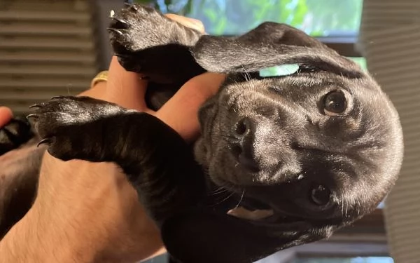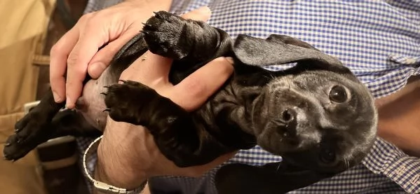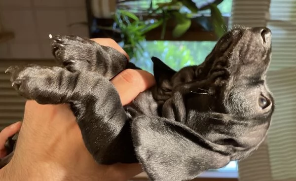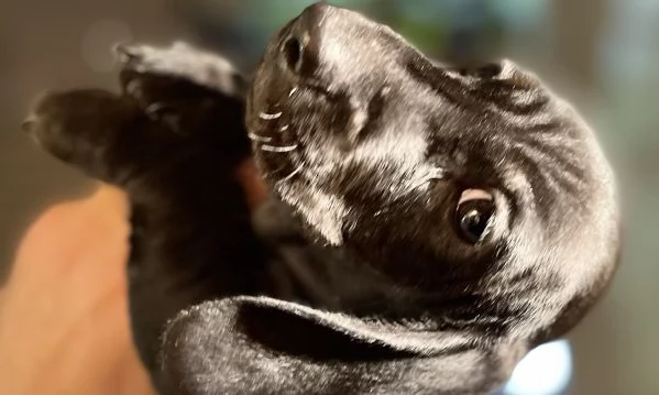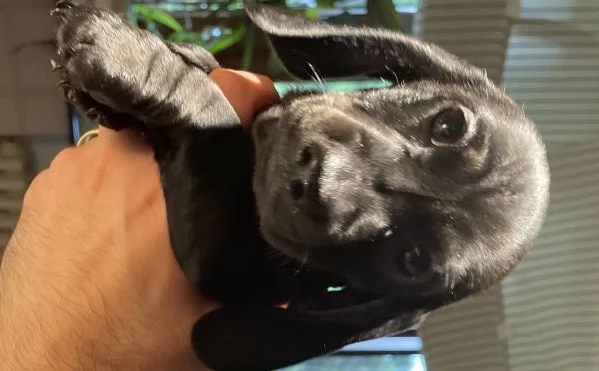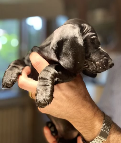 Cucciolo di bassotto di appena due mesi, taglia nana, dal raro mantello solid black. Si vende già svezzato, con due vaccini, microchippato e iscritto all’anagrafe canina.
