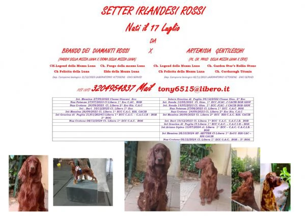 Proponiamo in vendita 5 splendidi cuccioli di setter irlandese con pedigree, figli di Ursula della Mezzaluna e di George dei Cinque castelli, entrambi con pedigree e discendenti di campioni mondiali ...
