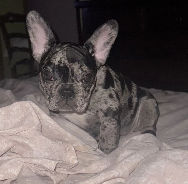 Piccola cucciola di bulldog francese esotic merle nata il 30 aprile 2025 cresciuta in ambiente familiare a stretto contatto con bambini